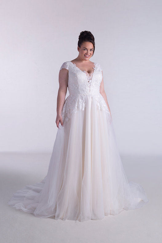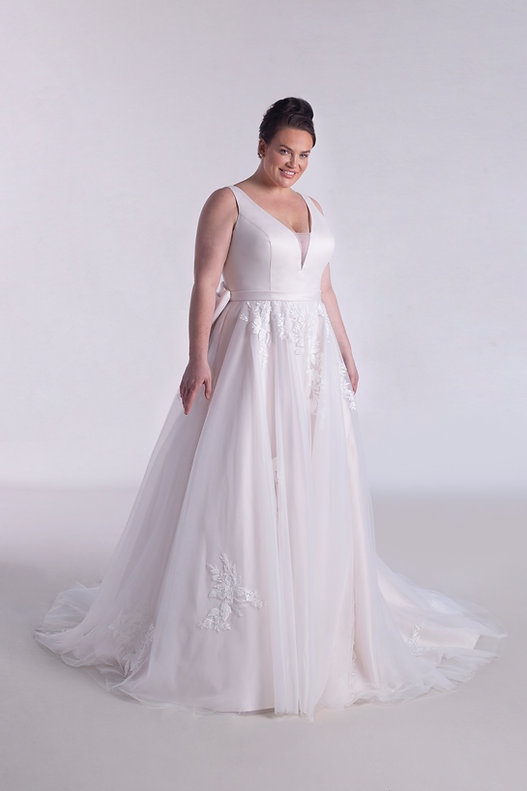 This refined A-line gown features a flowing tulle skirt paired with a fitted crepe bodice for a modern contrast. Long sleeves adorned with delicate lace and a plunging neckline add a touch of romance and sophistication.